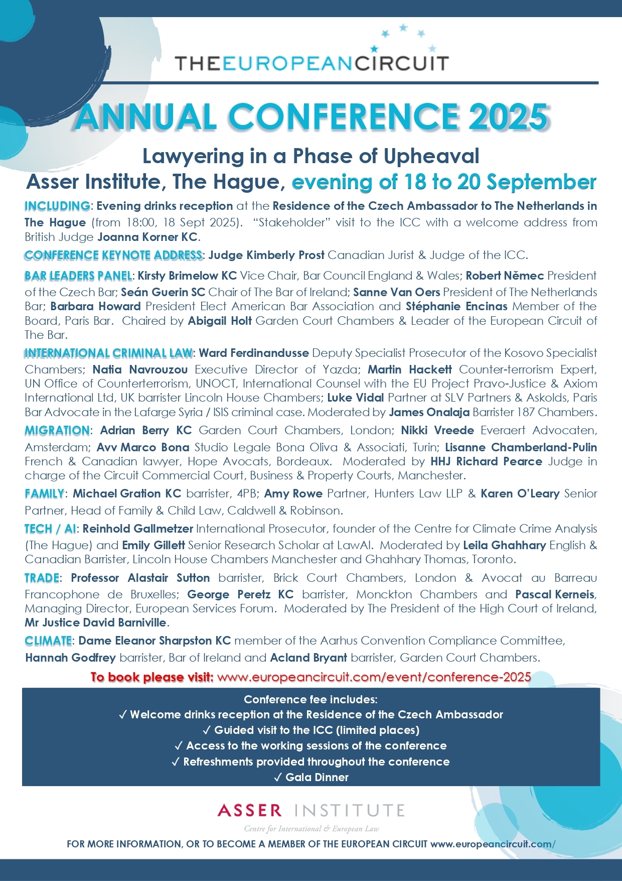 The European Circuit of the Bar will hold its 2025 Annual Conference in The Hague in the Netherlands from 18th to 20th September 2025, titled: Lawyering in a Phase of Upheaval.
